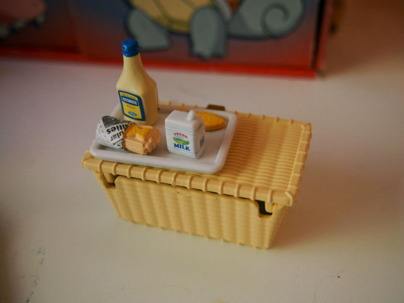 Francescan pitelemien aterimien lisäksi mukana tuli myös ruokaa (kori kuuluu toiseen settiin). Sylvanian Families -sarjan tarvikkeet ovat aivan ihastuttavia pikku yksityiskohdissaan! Kuvasta se ei erotu mutta esimerkiksi ranskanperunoiden kotelo on moldattu jopa tavalla, että se näyttää sanomalehdestä kääräistyltä! Miinuksena vain se, että tarrat on kiinnitettävä itse. Lykkyä pyttyyn meille mämmikourille :D Toinen ikävä juttu on se, että koska tarvikkeet ovat enimmäkseen hyllyssä, ne jäävät helposti laatikoiden ja hyllyjen pimentoihin kun pelottaa että katoavat esillä ollessaan jonnekin!